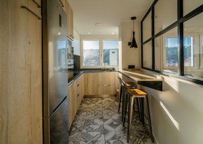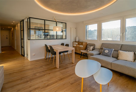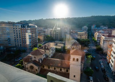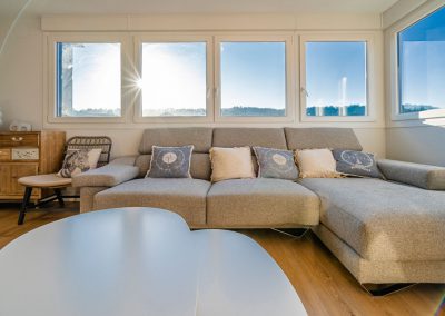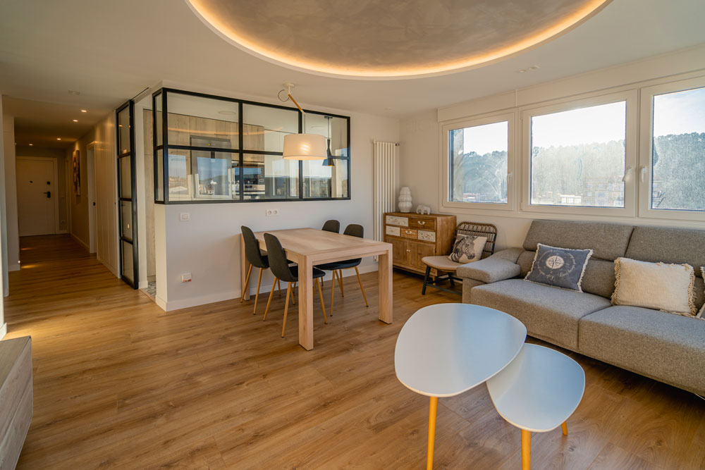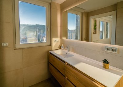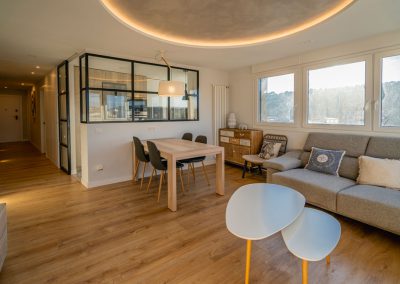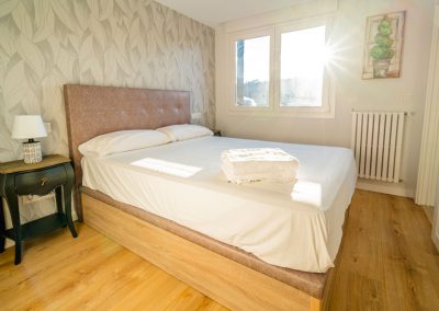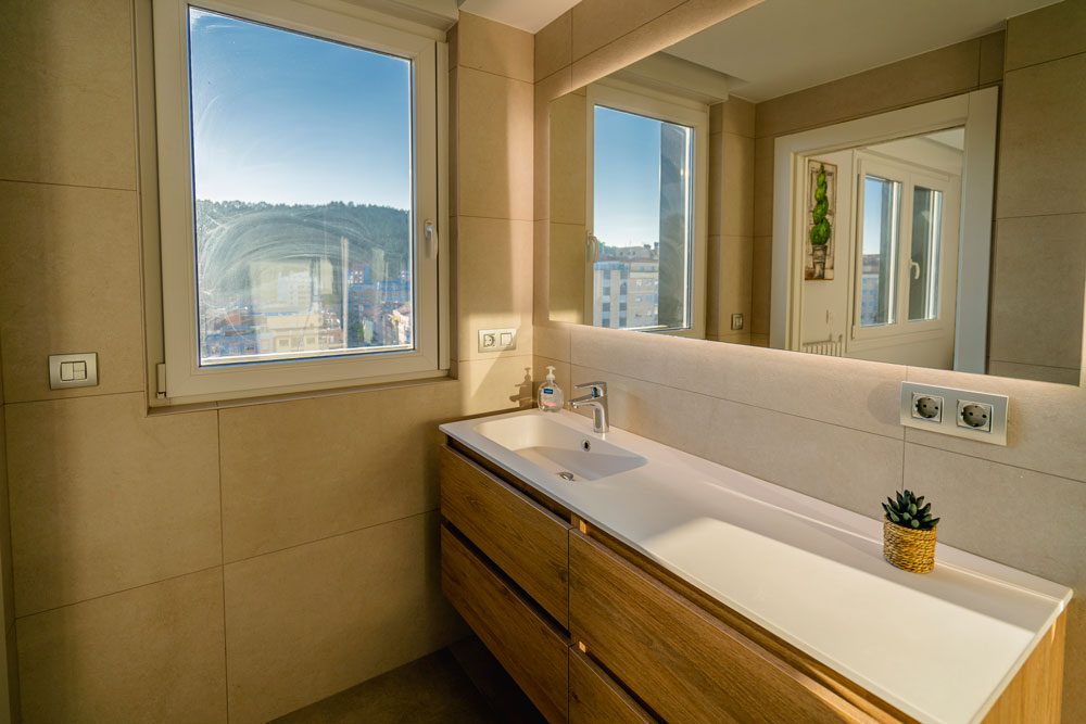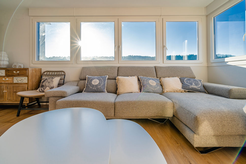 Por último, hay un gran espacio para el salón-comedor totalmente acristalado, ofreciendo unas vistas espectaculares de la ciudad de Burgos. Este dispone de una mesa de comedor con sillas, un sofá-cama grande y confortable con mesa baja y una TV de pantalla plana de 65″.