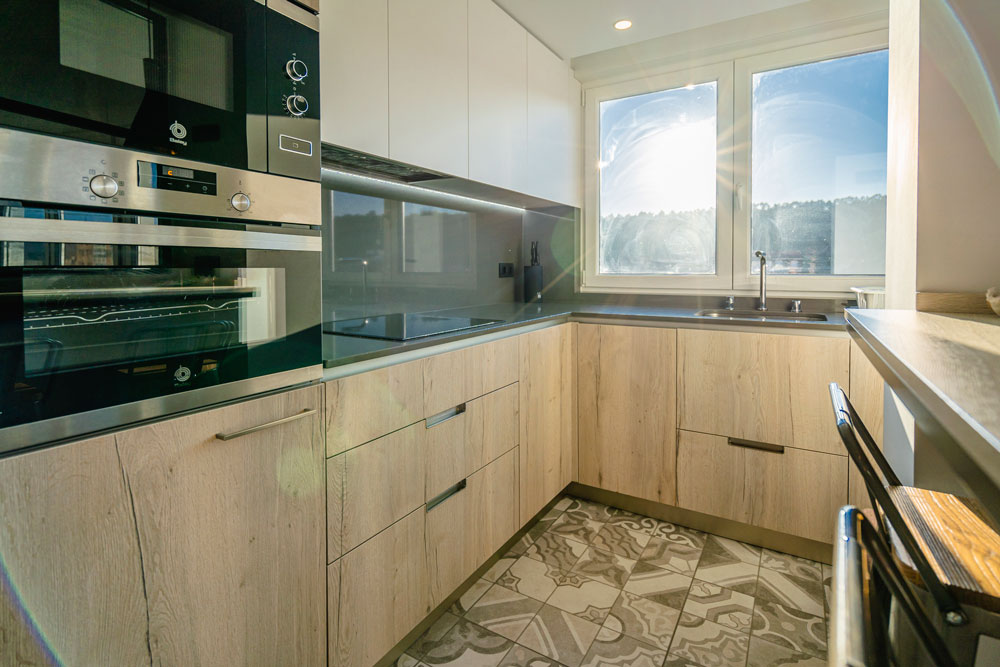 La cocina moderna está totalmente equipada con vitrocerámica, microondas, horno, lavavajillas, lavadora, frigorífico, congelador, sartenes, ollas, utensilios de cocina y menaje completo.