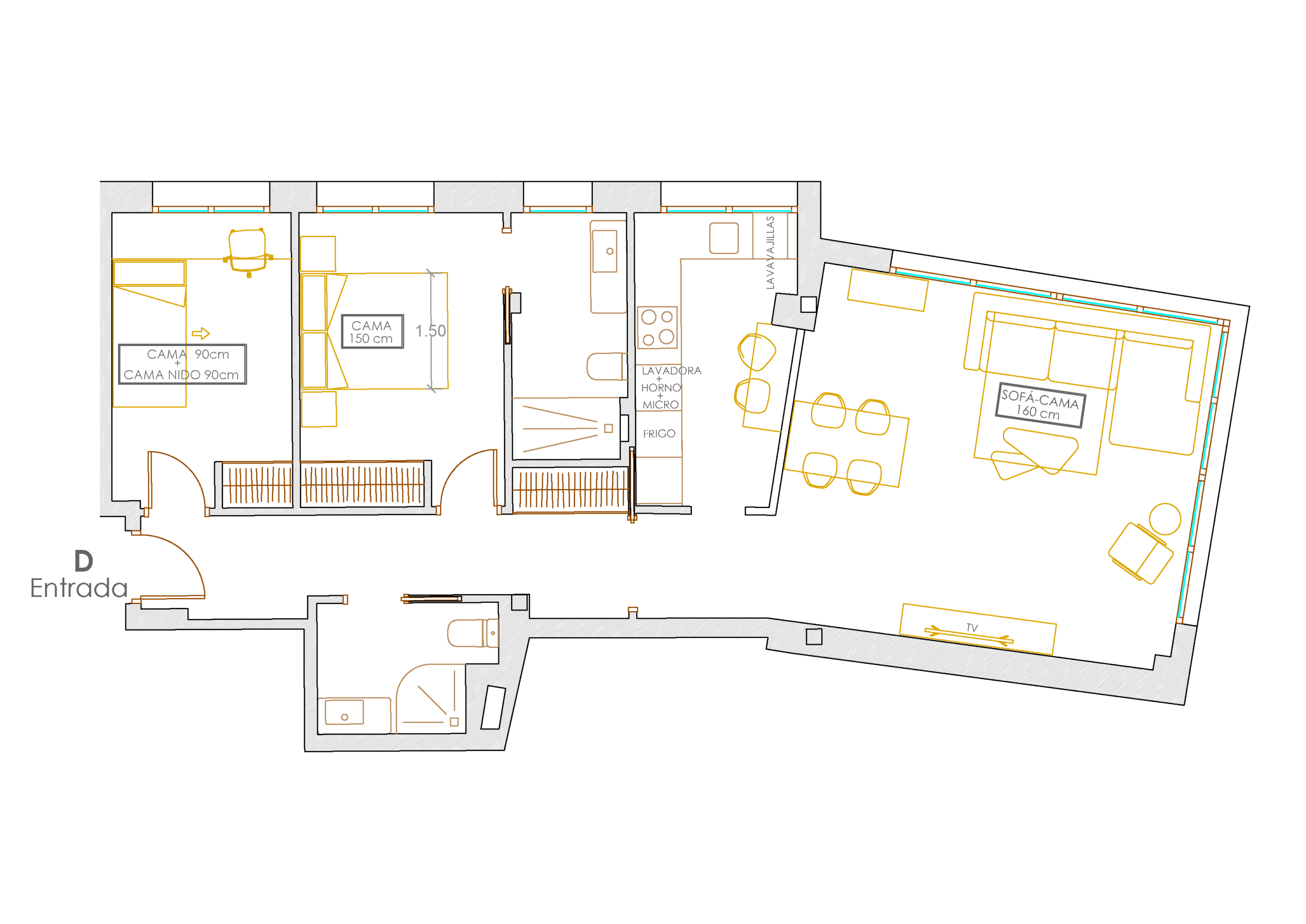 5 personas – 2 dormitorios – 3 camas – 1 sofá cama – 2 baños