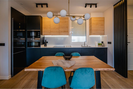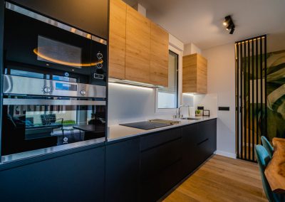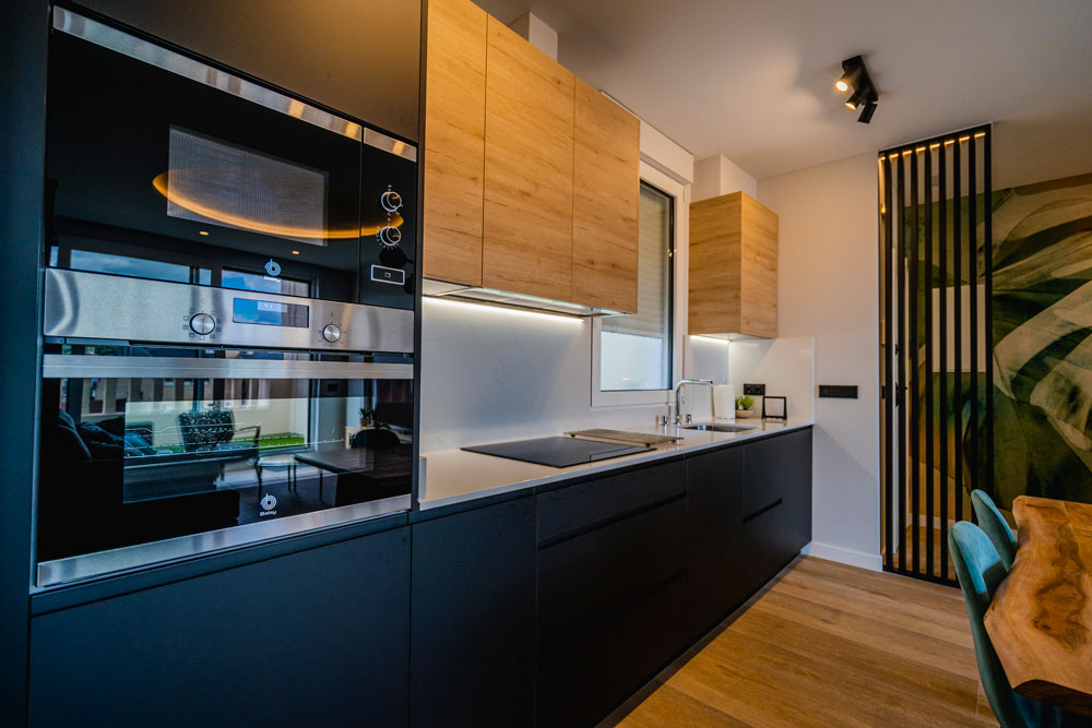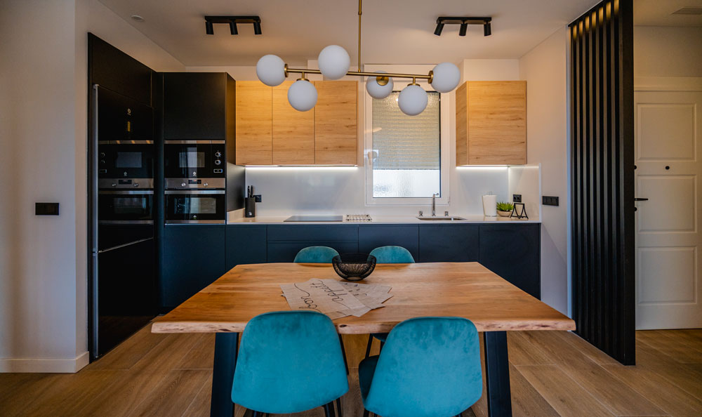 Cocina americana moderna totalmente equipada con vitrocerámica, microondas, horno, lavavajillas, lavadora, frigorífico, congelador, sartenes, ollas, utensilios de cocina y menaje completo.