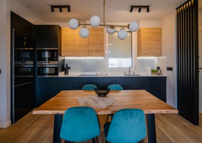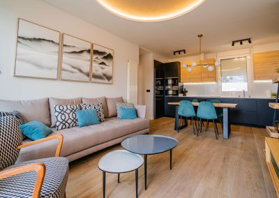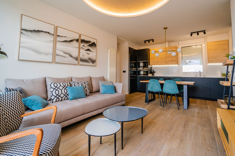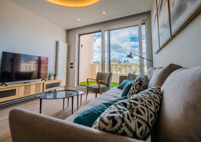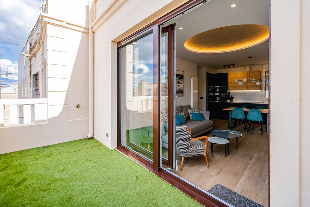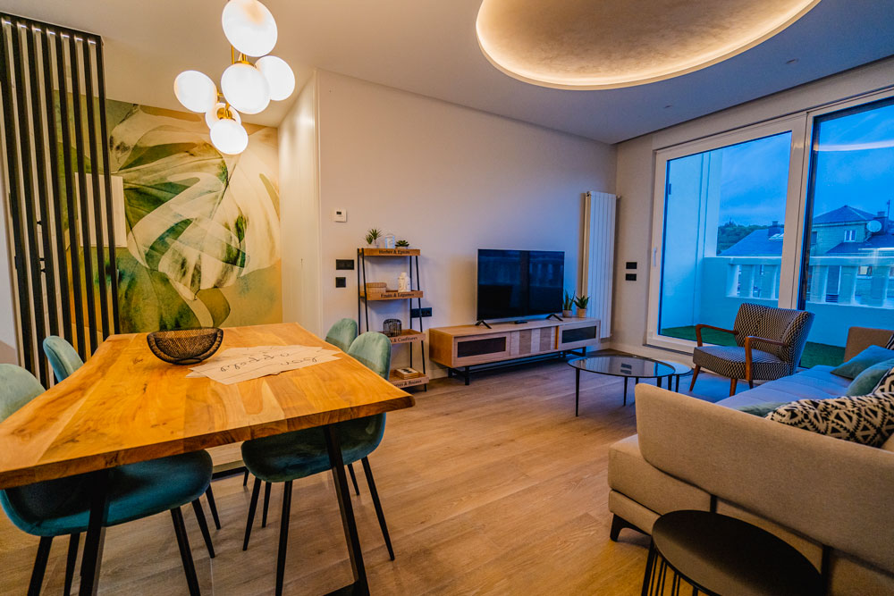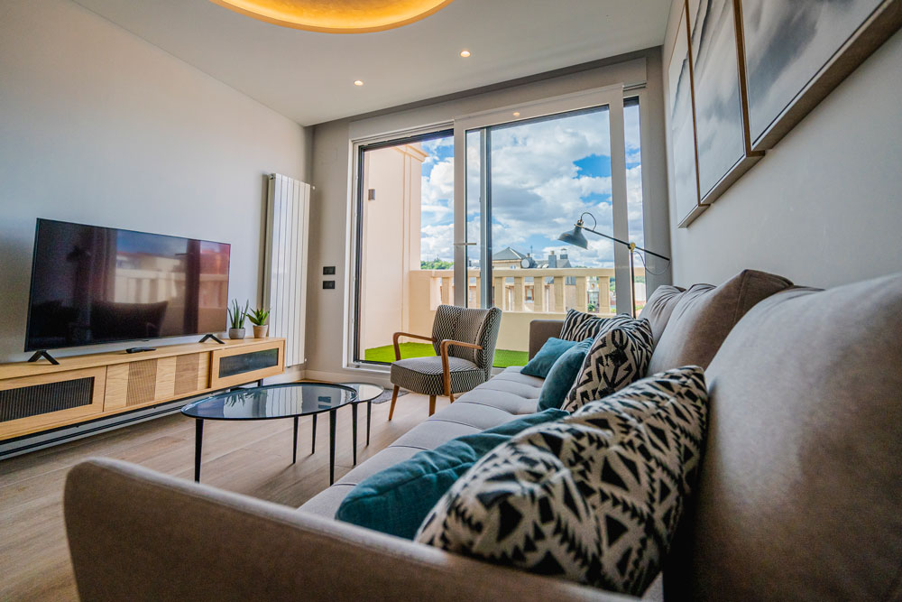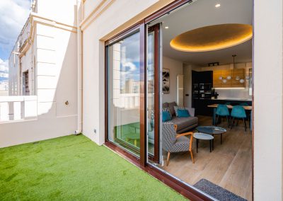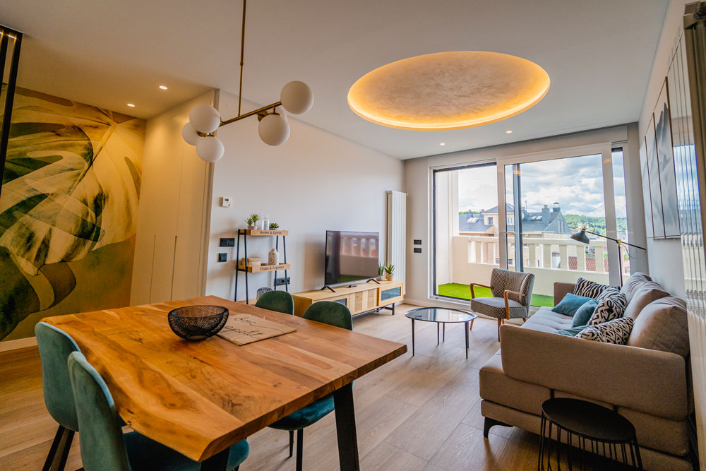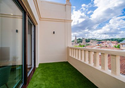 Por último, hay un gran espacio para el salón-comedor que termina en una espectacular terraza, ofreciendo unas vistas impresionantes de la Catedral de Burgos. Este dispone de una mesa de comedor con sillas, un sofá grande con mesa baja y una TV de pantalla plana de 55″.