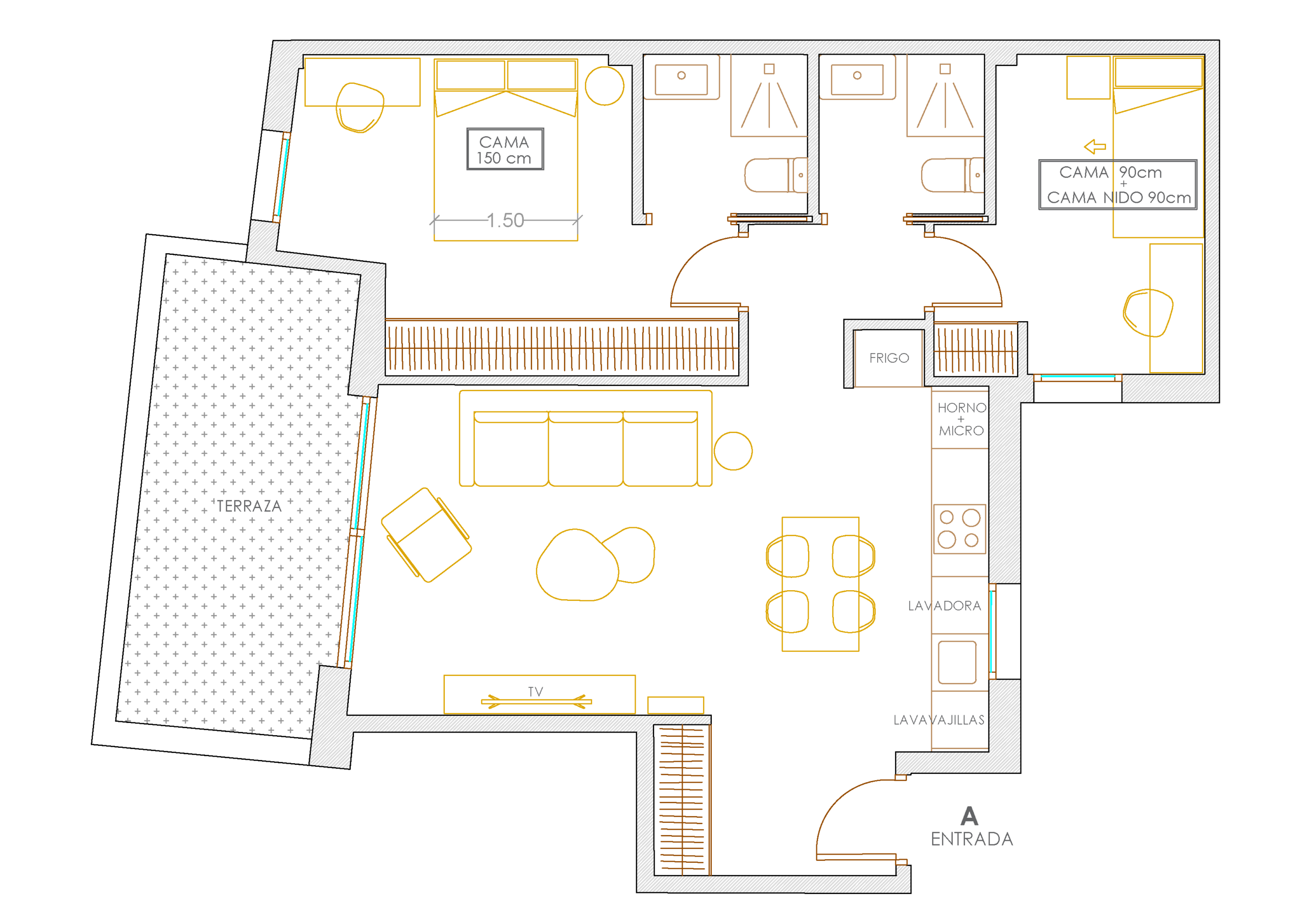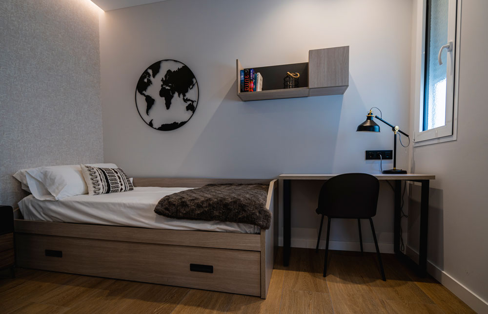 – Habitación con cama nido (2 camas de 90 x 200 cm), escritorio y armarios empotrados.