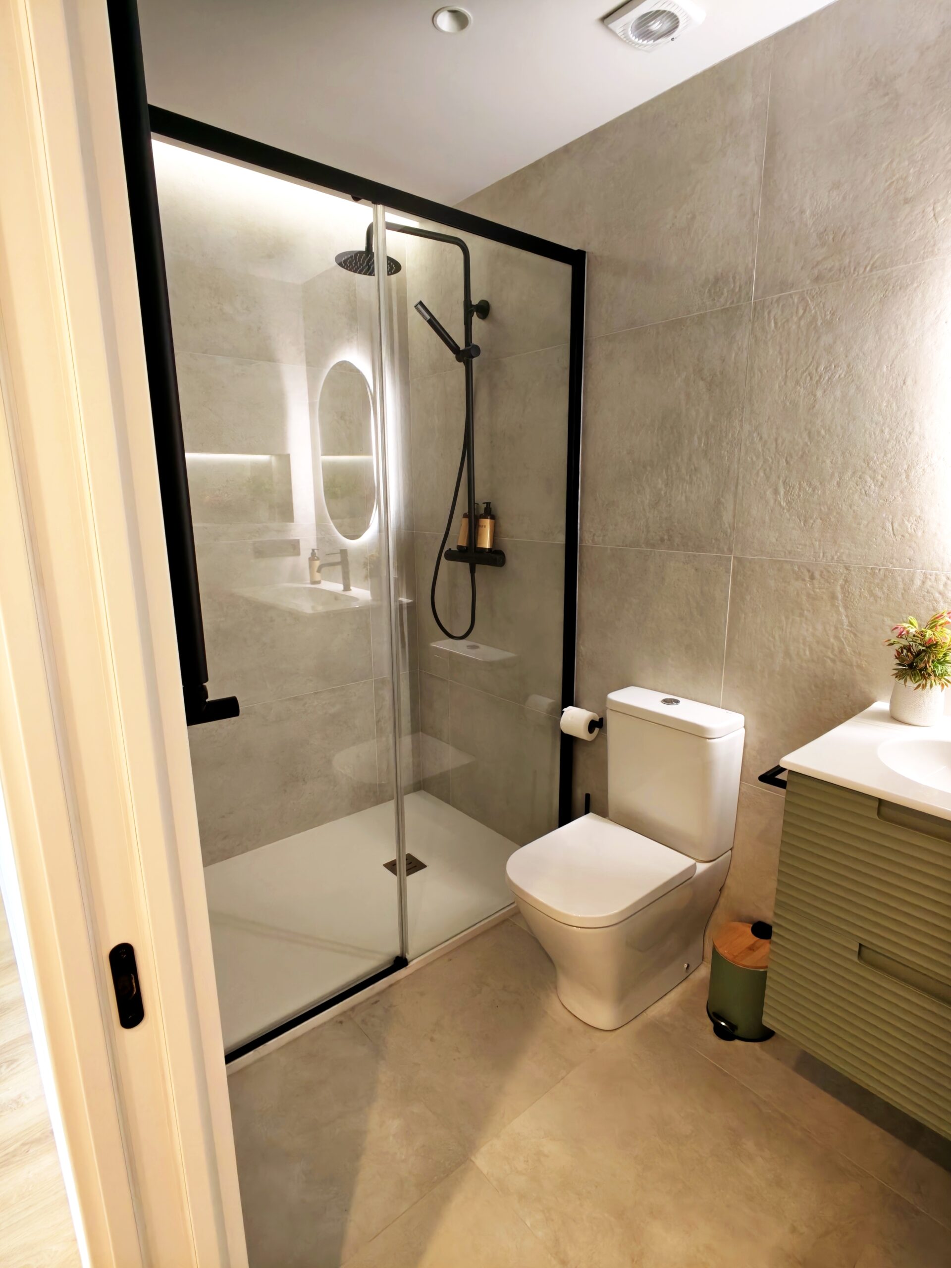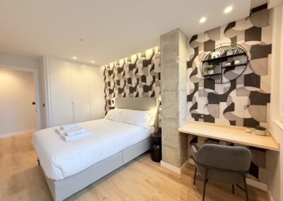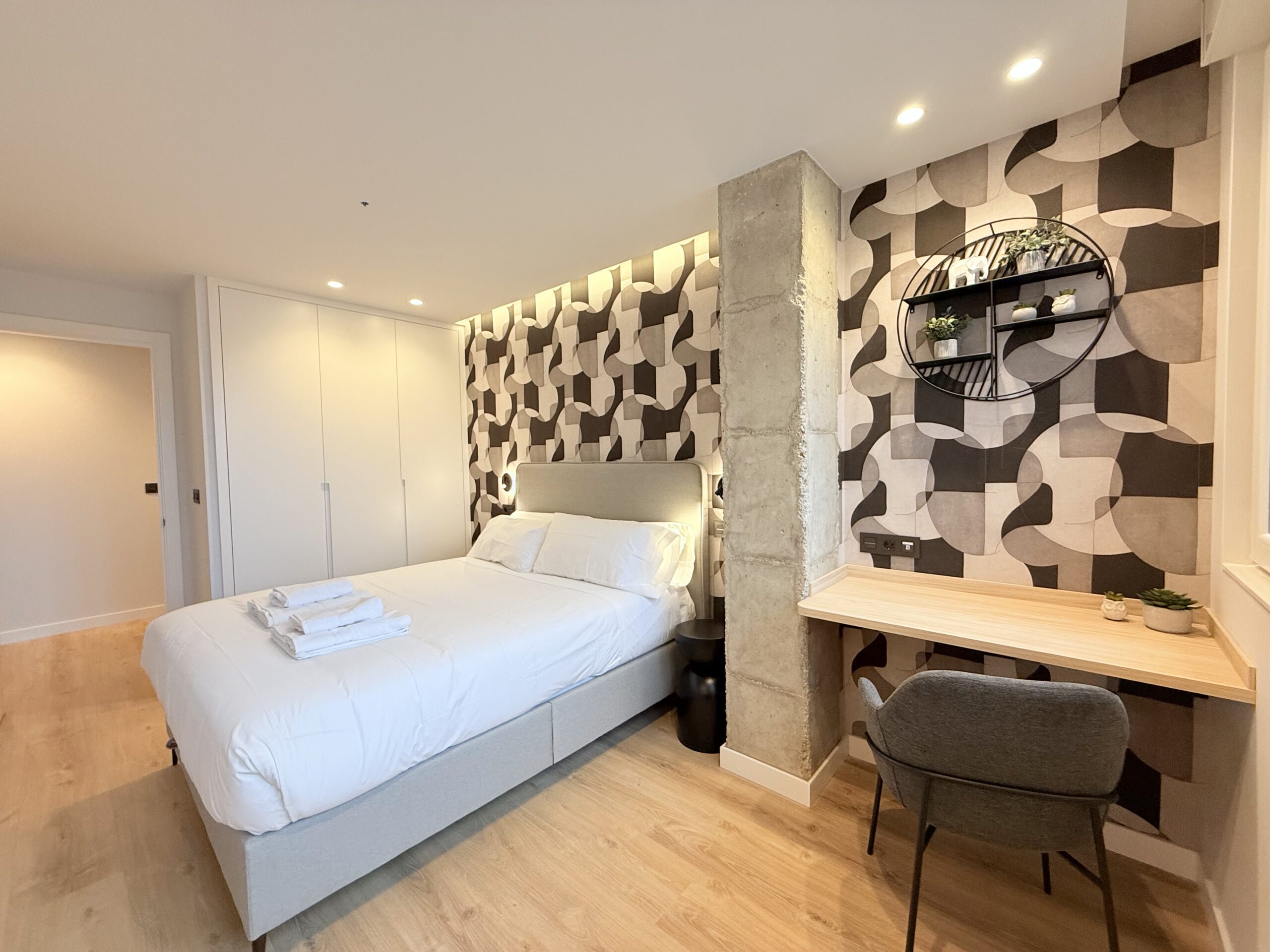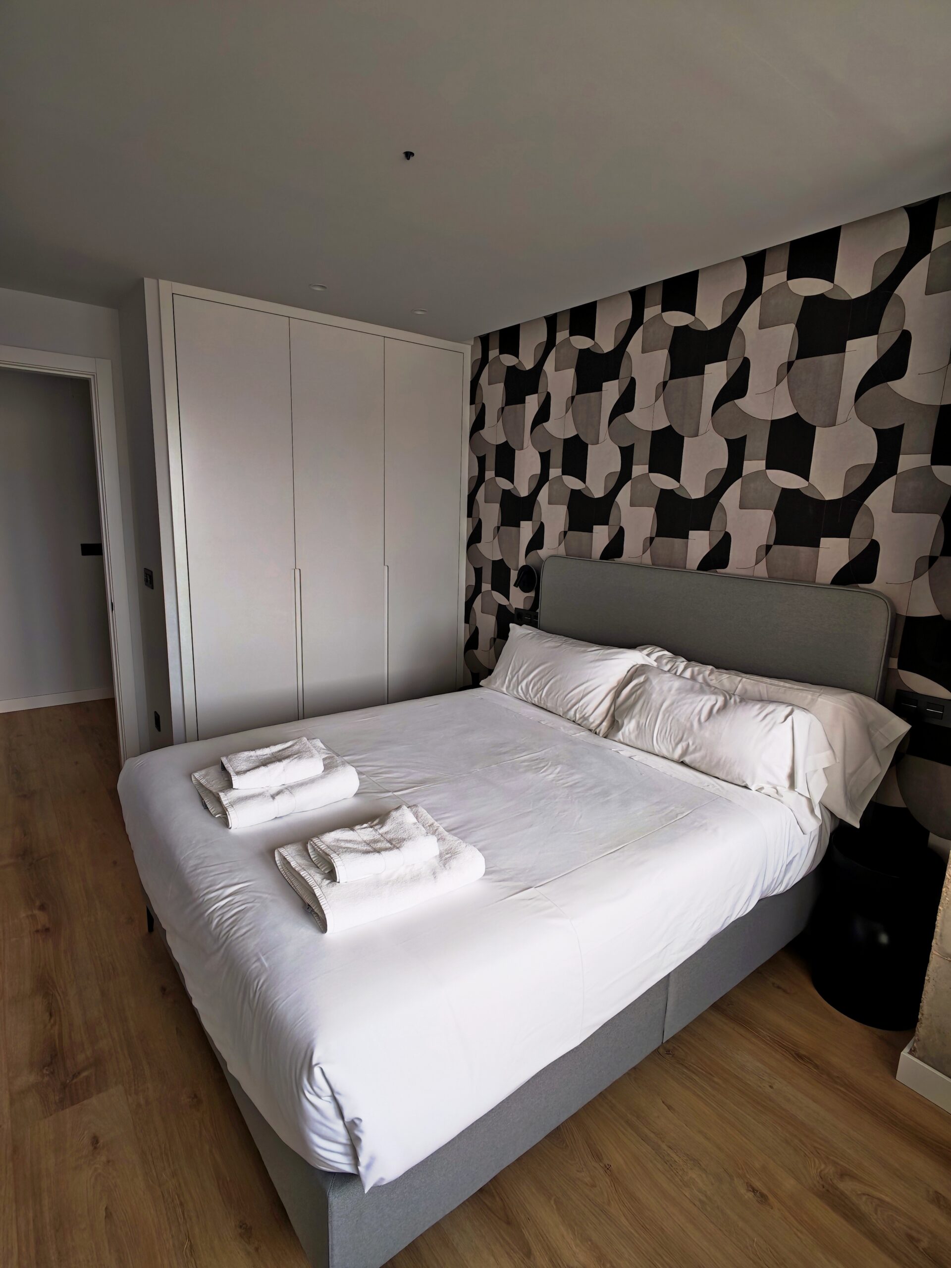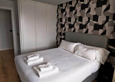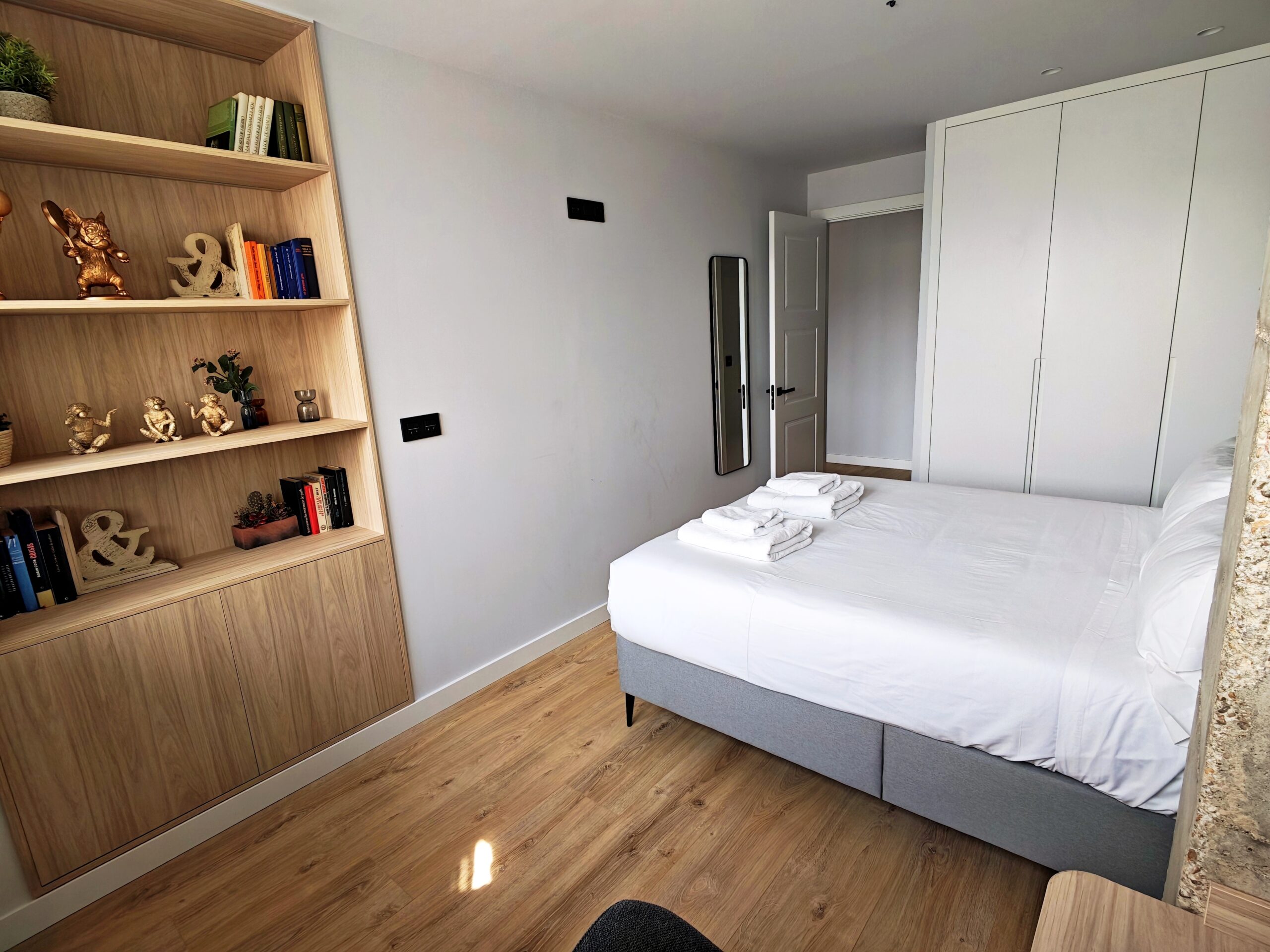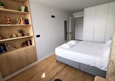 El apartamento dispone de un dormitorio con una cama doble de 150×200 cm y una zona de vestidor con armarios empotrados. Además de un baño suite completo con ducha.