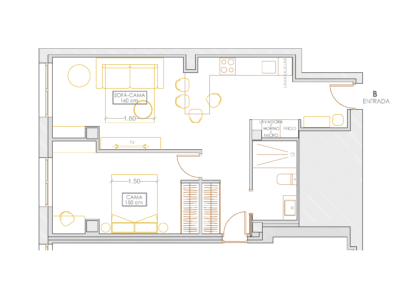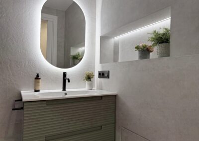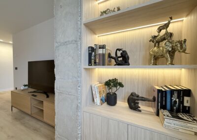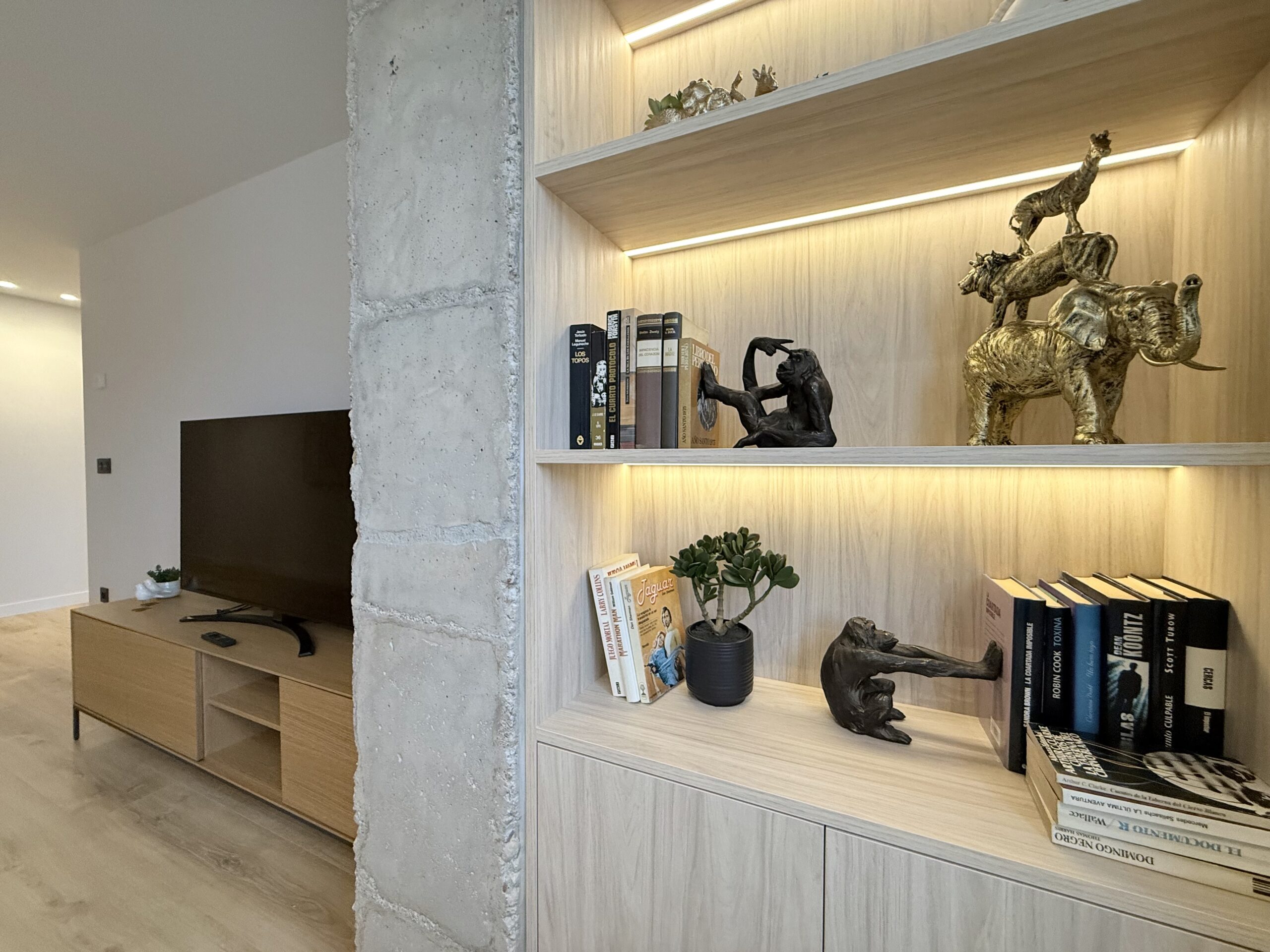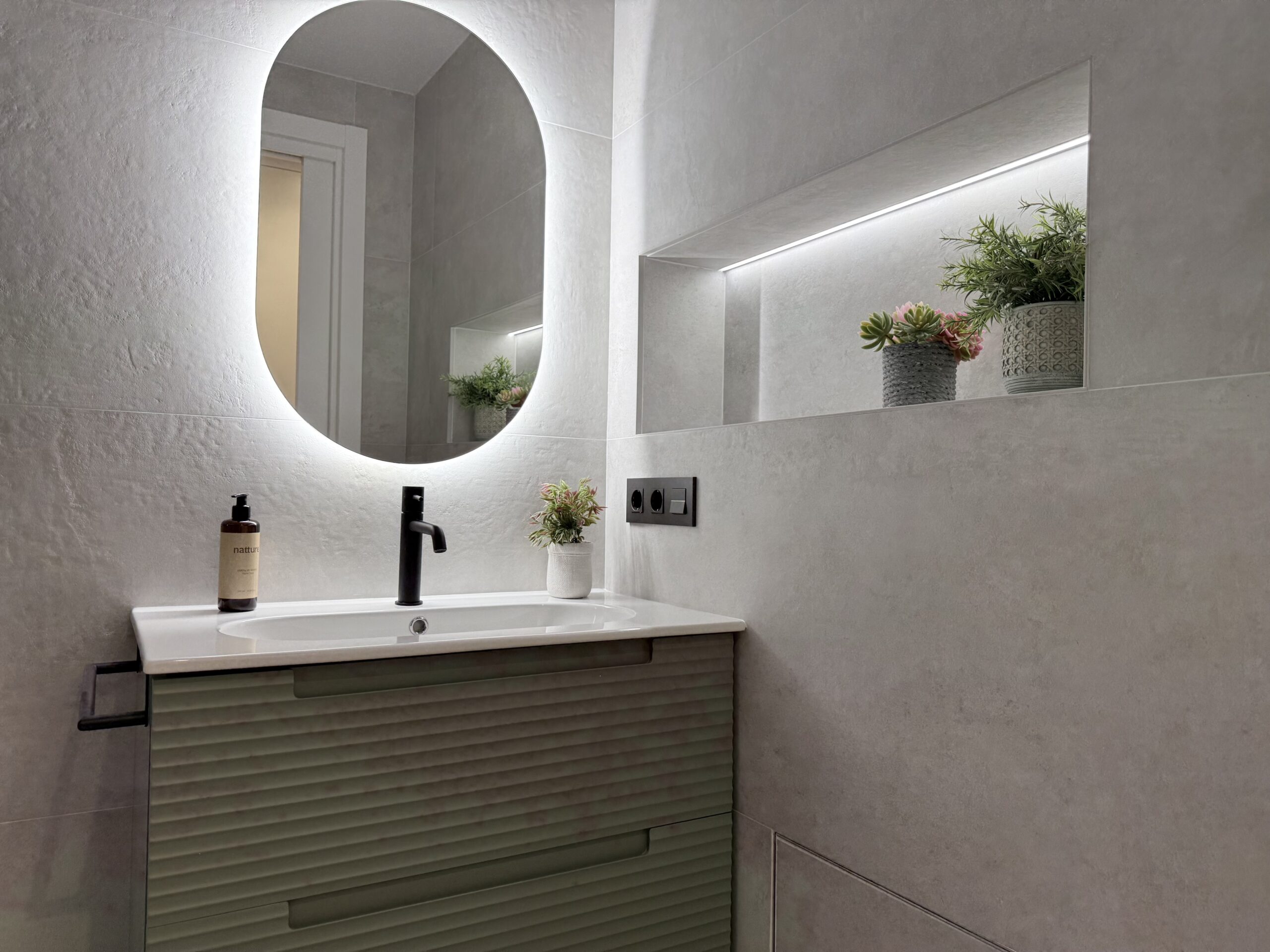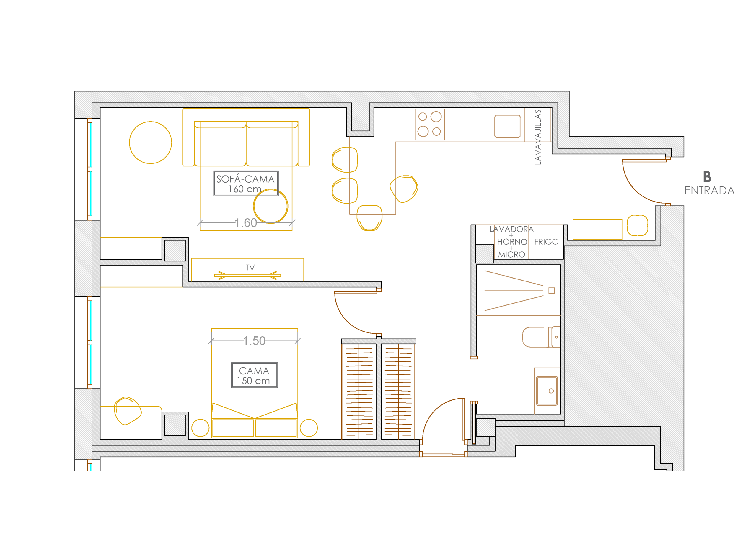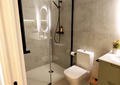El apartamento dispone de un dormitorio con una cama doble de 150×200 cm y una zona de vestidor con armarios empotrados. Además de un baño suite completo con ducha.