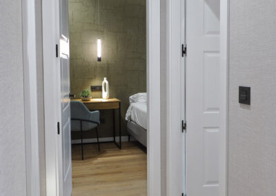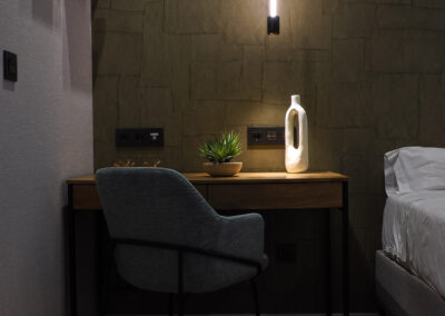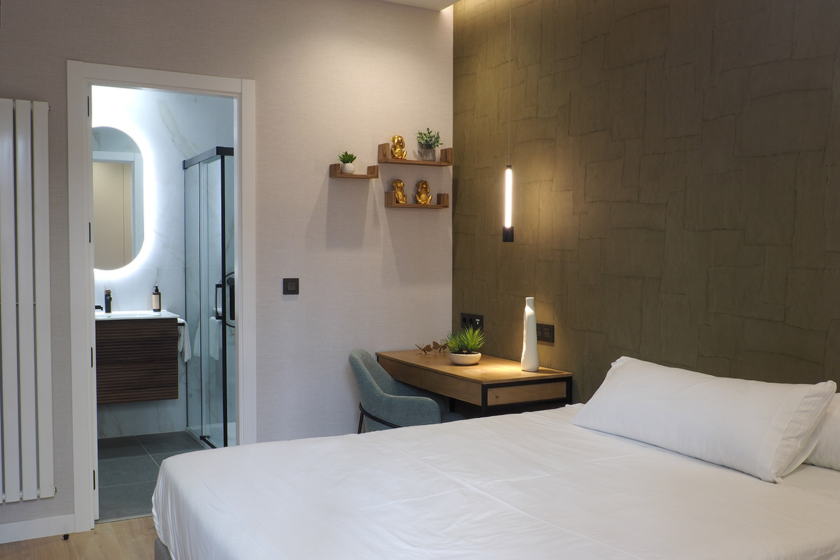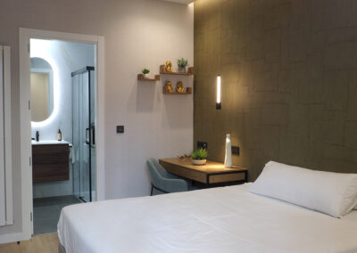 Habitación con cama doble de 150 x 200 cm, baño privado, armario empotrado y escritorio.